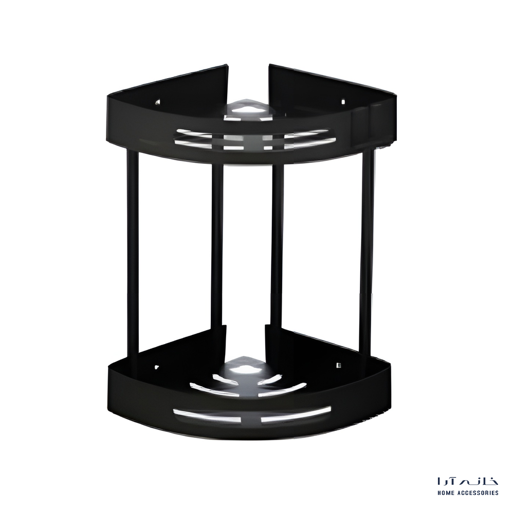 شلف کنج دوطبقه مدل 2012/BL اسمارت با رنگ مشکی، طراحی مدرن و کاربردی برای نظمدهی به فضای حمام و سرویس بهداشتی. ساختهشده از استنلس استیل ضدزنگ، مقاوم در برابر رطوبت، بخار و تغییر رنگ.