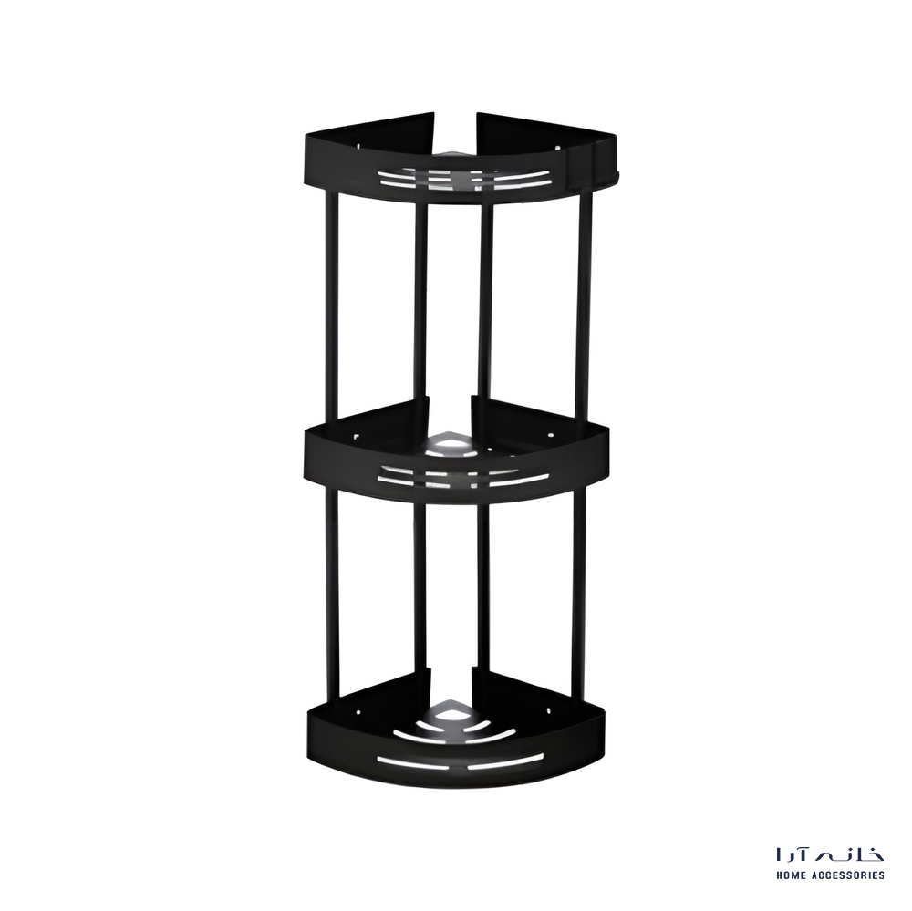 شلف کنج سهطبقه مدل 2013/BL اسمارت با رنگ مشکی، طراحی مدرن و کاربردی برای نظمدهی کامل به فضای حمام. ساختهشده از استنلس استیل ضدزنگ، مقاوم در برابر رطوبت، بخار و تغییر رنگ.