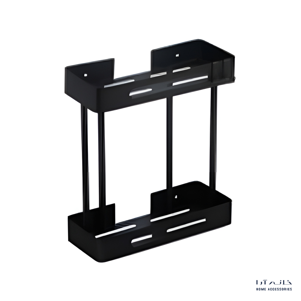 شلف دیواری دوطبقه مدل 2022/BL اسمارت با رنگ مشکی، طراحی مدرن و کاربردی برای نظمدهی به فضای حمام و سرویس بهداشتی. ساختهشده از استنلس استیل ضدزنگ، مقاوم در برابر رطوبت، بخار و تغییر رنگ.