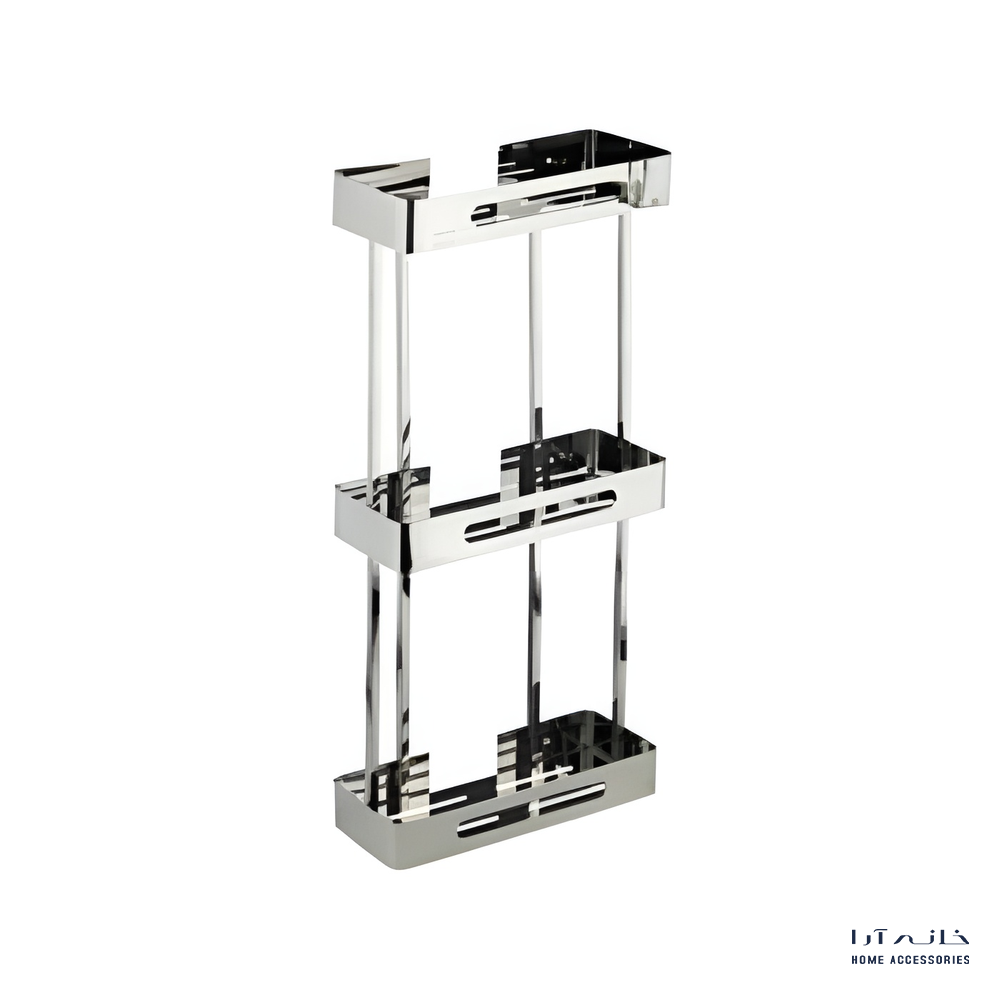 شلف دیواری سهطبقه مدل 2023/CR اسمارت با رنگ کروم، طراحی براق و کاربردی برای نظمدهی کامل به فضای حمام. ساختهشده از استنلس استیل ضدزنگ، مقاوم در برابر رطوبت، بخار و تغییر رنگ.