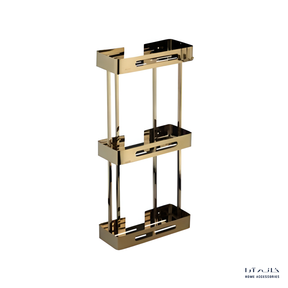 شلف دیواری سهطبقه مدل 2023/GO اسمارت با رنگ طلایی، طراحی لوکس و کاربردی برای نظمدهی کامل به فضای حمام. ساختهشده از استنلس استیل ضدزنگ، مقاوم در برابر رطوبت، بخار و تغییر رنگ.