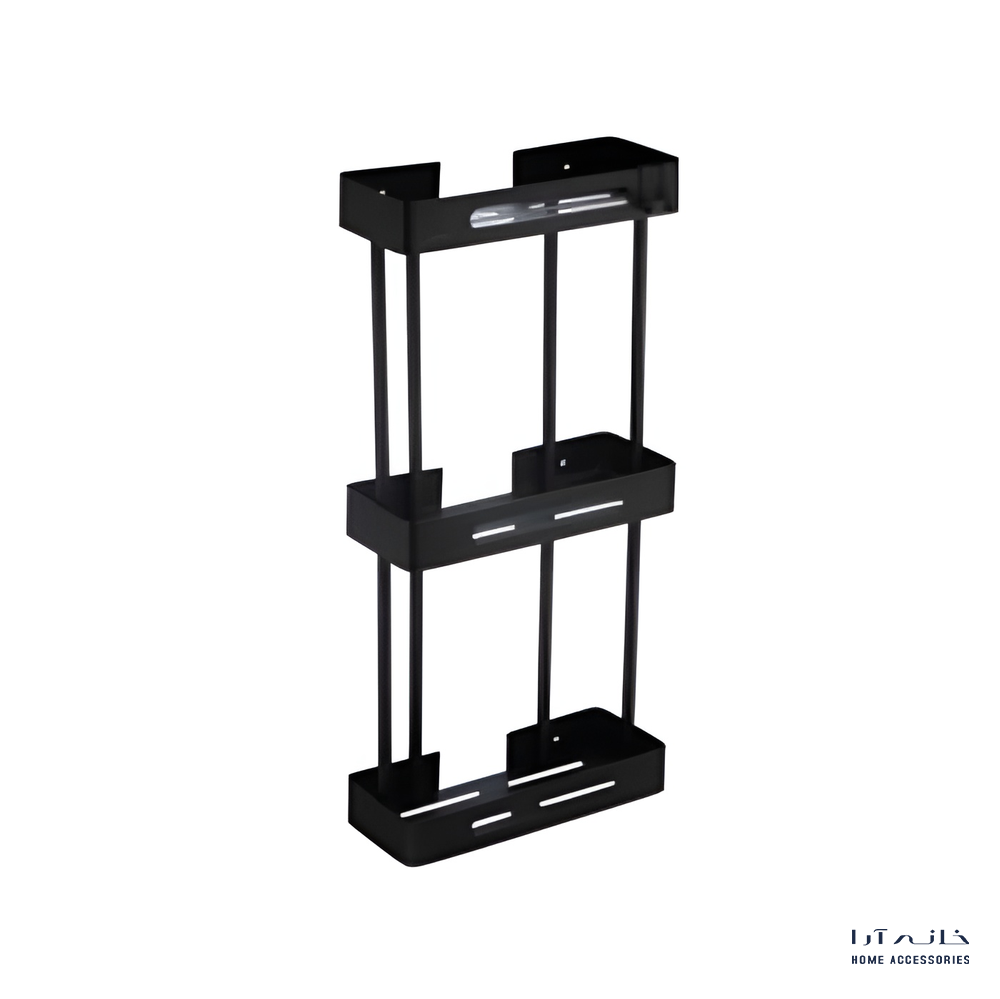 شلف دیواری سهطبقه مدل 2023/BL اسمارت با رنگ مشکی، طراحی مدرن و کاربردی برای نظمدهی کامل به فضای حمام. ساختهشده از استنلس استیل ضدزنگ، مقاوم در برابر رطوبت، بخار و تغییر رنگ.