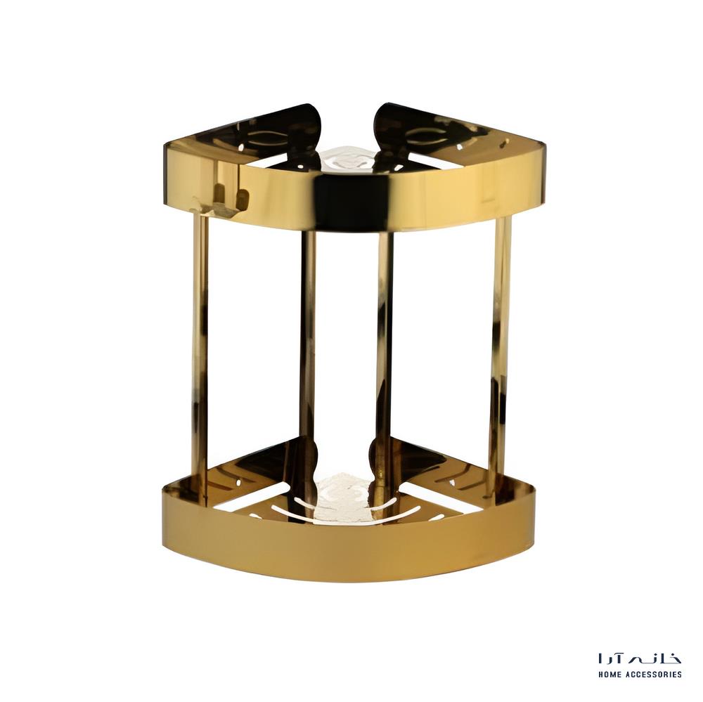 شلف کنج دیواری دوطبقه مدل 1012/GO اسمارت با رنگ طلایی، طراحی لوکس و کاربردی برای استفاده بهینه از فضای گوشهای حمام. ساختهشده از استنلس استیل ضدزنگ، مقاوم در برابر رطوبت، بخار و تغییر رنگ.