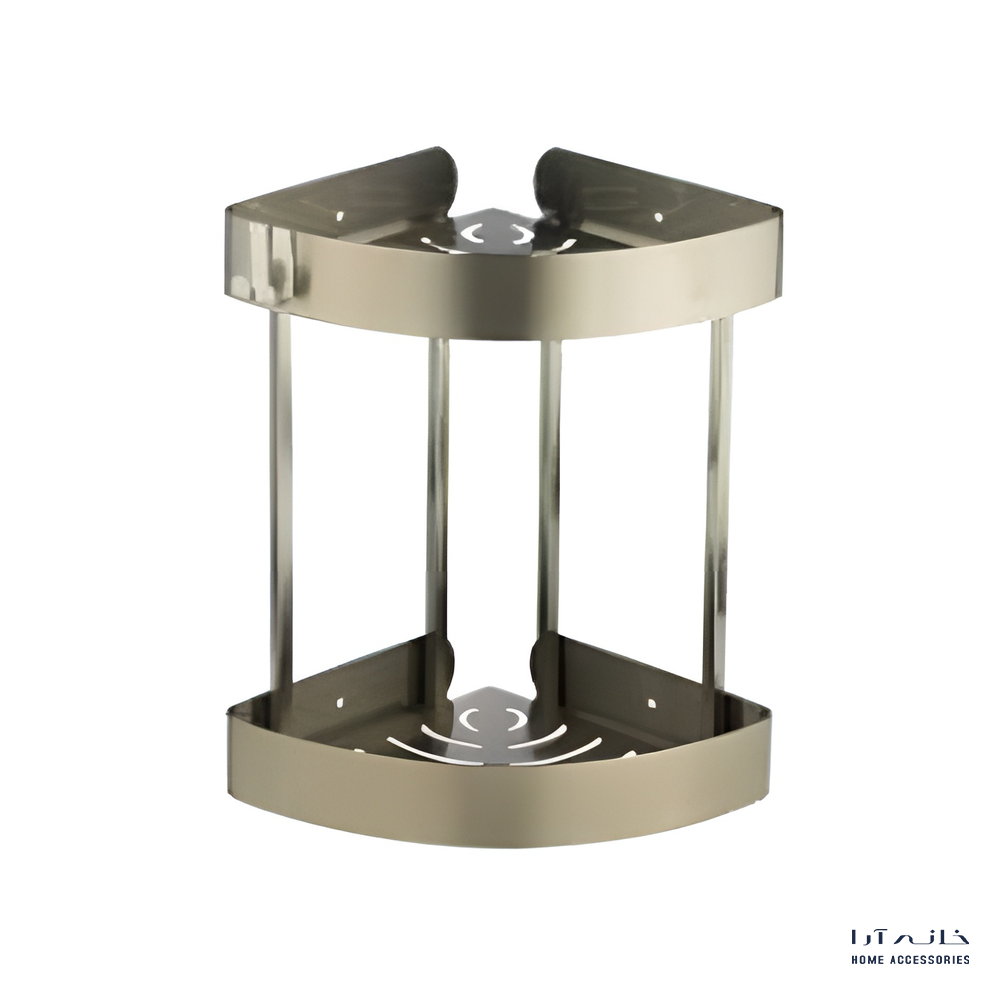 شلف کنج دیواری دوطبقه مدل 1012/BN اسمارت با رنگ نیکل خشدار، طراحی مدرن و مقاوم برای استفاده بهینه از فضای گوشهای حمام. ساختهشده از استنلس استیل ضدزنگ، مقاوم در برابر رطوبت، بخار و تغییر رنگ.
