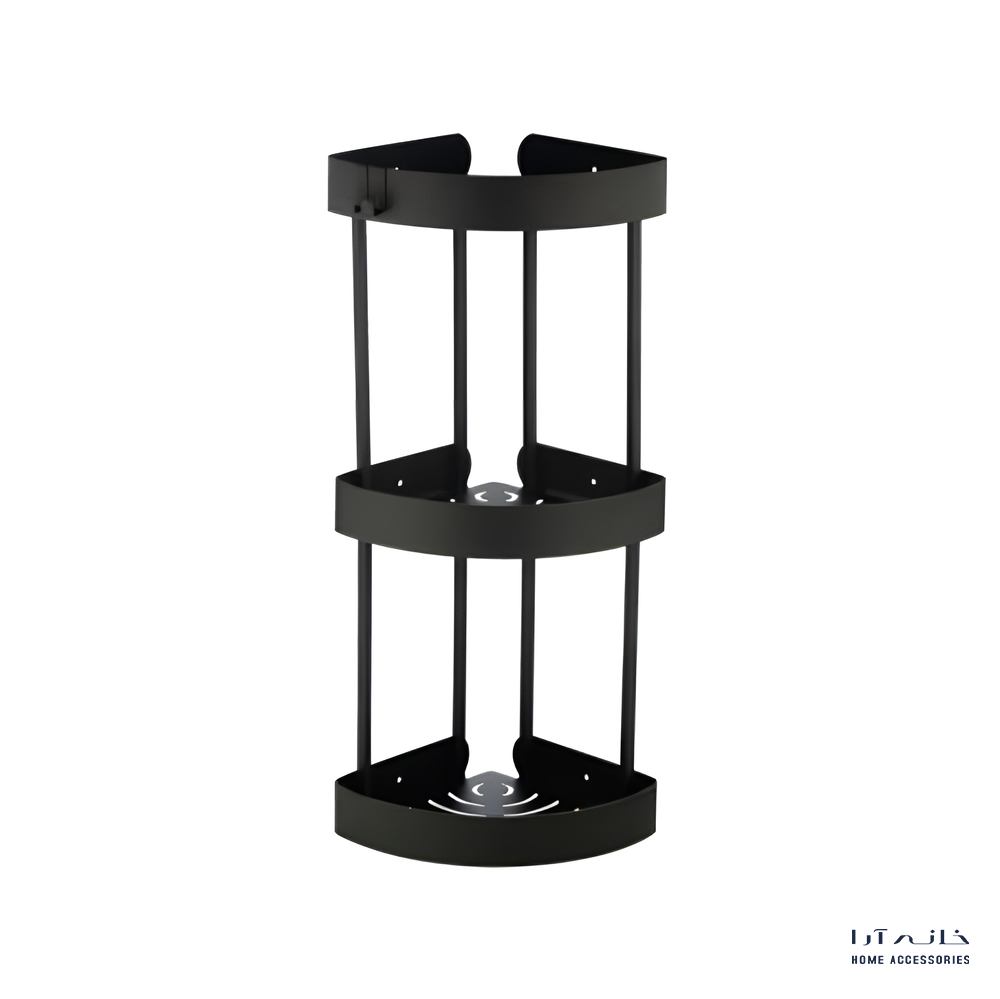 شلف کنج دیواری سهطبقه مدل 1013/BL اسمارت با رنگ مشکی، طراحی مدرن و کاربردی برای استفاده حداکثری از فضای گوشهای حمام. ساختهشده از استنلس استیل ضدزنگ، مقاوم در برابر رطوبت، بخار و تغییر رنگ.