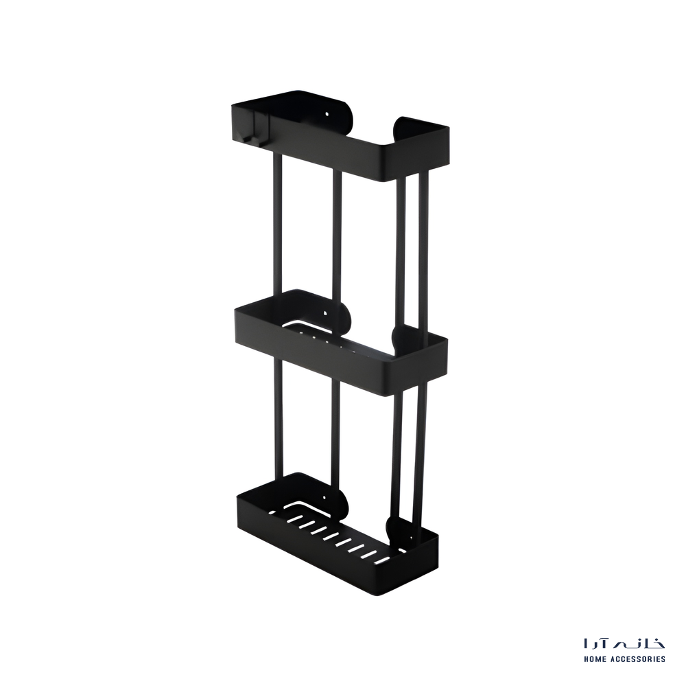 شلف دیواری سهطبقه مدل 1023/BL اسمارت با رنگ مشکی، طراحی مدرن و کاربردی برای استفاده حداکثری از فضای دیواری حمام. ساختهشده از استنلس استیل ضدزنگ، مقاوم در برابر رطوبت، بخار و تغییر رنگ.