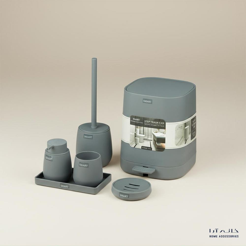 ست ۶ تکه سرویس بهداشتی مدل Alvin/Gray برند اسمارت، این ست اکسسوری سرویس بهداشتی و حمام شامل جا مایع، جا مسواکی، سینی، جا صابونی، فرچه توالتشوی و سطل زباله؛ با رنگ طوسی، مقاوم در برابر رطوبت با متریال پلی پروپیلن و چوب بامبو، مناسب برای نظمدهی و زیباسازی سرویس بهداشتی.